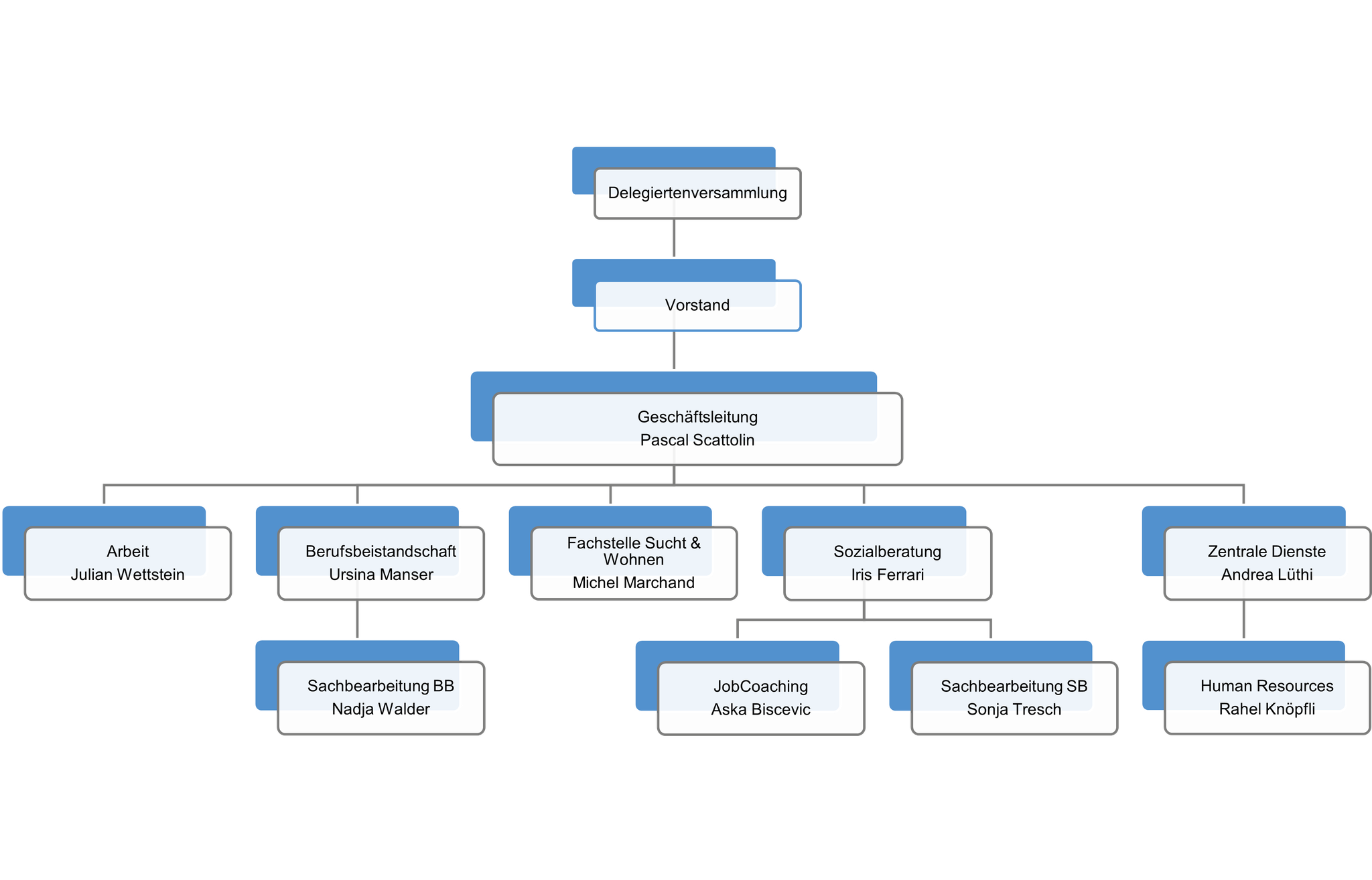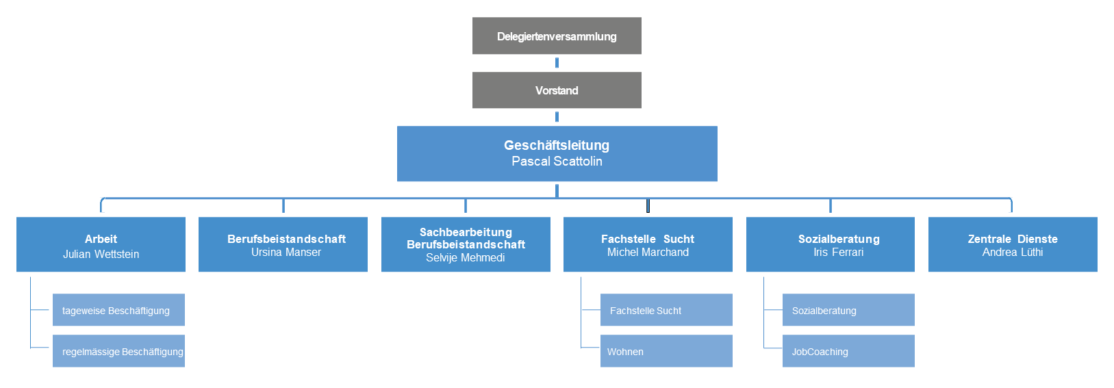 Ein schematischer Blick auf unsere Institution: Anhand der Abbildung können Sie leicht nachvollziehen, wie die Sozialen Dienste Bezirk Uster organisiert sind. Unseren sozialen Auftrag erfüllen wir mit den sechs abgebildeten Abteilungen, der Geschäftsstelle sowie dem Vorstand und der Delegiertenversammlung.